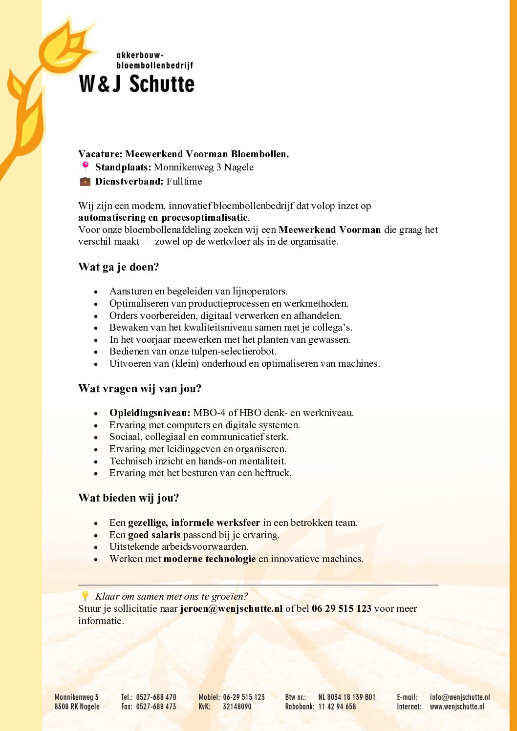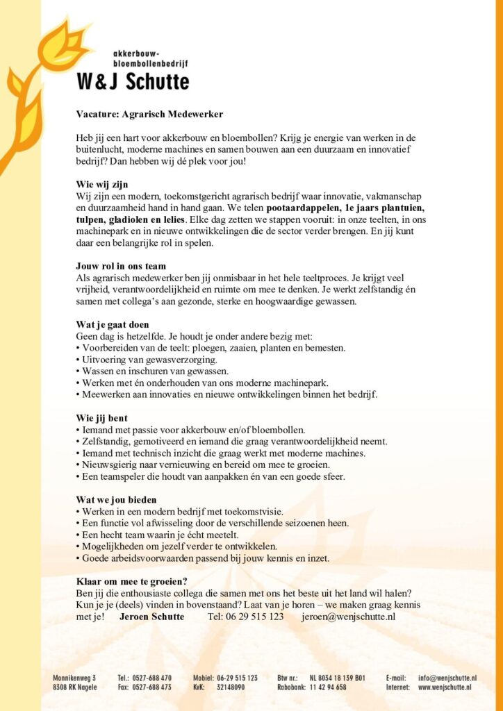 De teelten van alle gewassen word verzorgd door m.t.s. W en J Schutte. De pootaardappelen worden opgeslagen, gesorteerd en afgezet door Schutte-van de Putte V.O.F. De verwerking, afzet en handel van de bloembollen en 1e jaars plantuien wordT verzorgd door Schutte Handel B.V. De drie bedrijven werken intensief samen op locatie Monnikenweg 3 Nagele.
